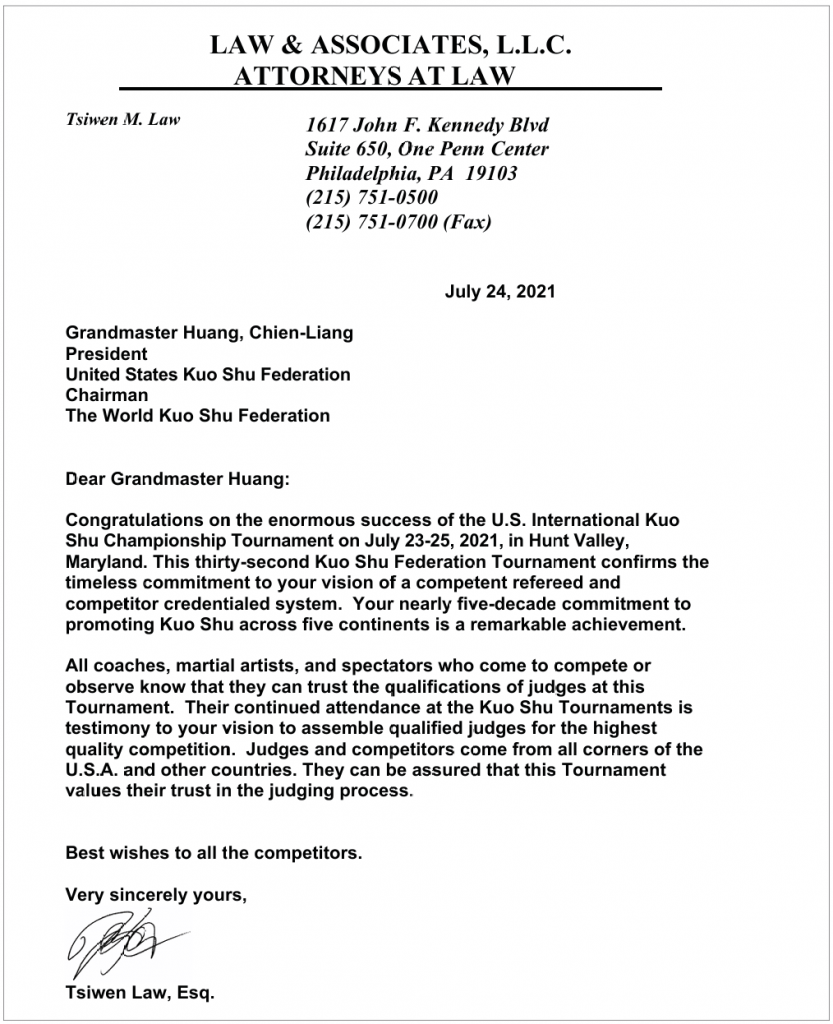 From THE USKSF GENERAL COUNSEL TSIWEN M. LAW, ESQ.